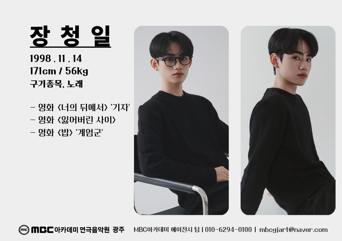 장청일 [남성 · 1998년생] 소속 성인 매체연기반 생년월일 1998-11-14 키 171cm 몸무게 56kg 이메일 mbcgjart@naver.com 담당자 총괄팀장 (010-6294-0100) 필모그래피 Filmography 장청일 - 성인 매체연기반 목록
