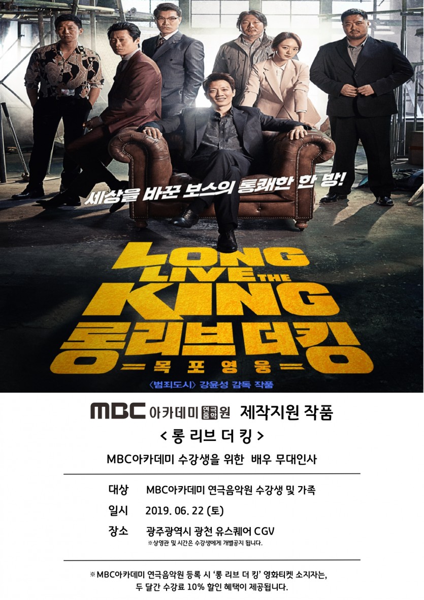MBC아카데미 제작지원 영화 '롱 리브 더 킹' 수강생 시사회 페이지 정보 작성자 관리자 댓글 0건 조회 32,476회 작성일 19-06-19 20:42 본문 MBC아카데미 제작지원 영화 '롱 리브 더 킹' 수강생 시사회 목록 이전글 [모델센터] 11기 모델캠프 19.06.28 다음글 [연기센터] 모델연기반 개강 19.05.21