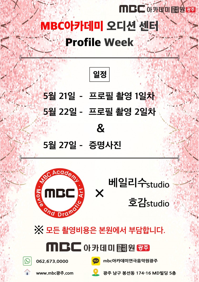 < 프로필 위크 > - 수강생 전원 프로필 촬영 페이지 정보 작성자 관리자 댓글 0건 조회 32,528회 작성일 19-04-15 21:25 본문 < 프로필 위크 > - 수강생 전원 프로필 촬영 목록 이전글 [연기센터] 모델연기반 개강 19.05.21 다음글 2020학년도 예고입시반 모집 19.04.12