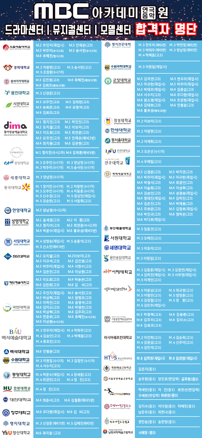 2014학년 ~ 2018학년 합격자 명단 페이지 정보 작성자 관리자 댓글 0건 조회 31,200회 작성일 18-02-09 19:16 본문 2014학년 ~ 2018학년 합격자 명단 드라마센터 | 뮤지컬센터 | 모델센터 목록 이전글 교육부 진로진학 인증기관 18.02.14 다음글 2018학년도 입시반|재 입시반 최종합격자! 축하합니다! 18.02.09