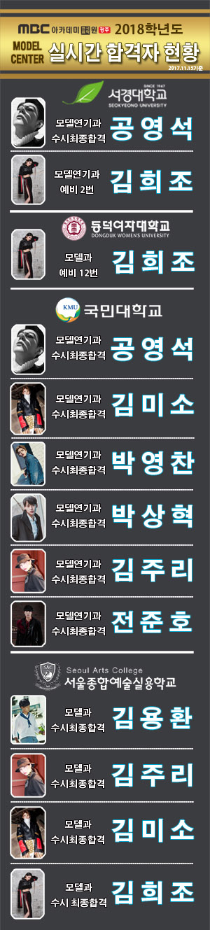 [모델센터] 2018학년도 수시합격자 현황 페이지 정보 작성자 관리자 댓글 0건 조회 31,234회 작성일 17-11-29 20:04 본문 2018학년도 수시합격자 현황 목록 이전글 [드라마센터] 하은찬 학생 한림예고 신입학 합격! 17.11.29 다음글 [뮤직센터] 2018학년도 수시합격자 현황 17.11.29