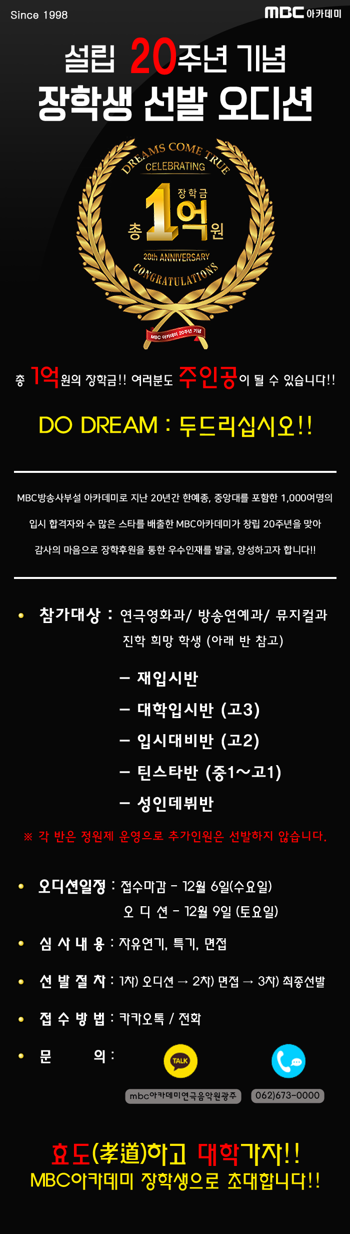 1,000여명의 입시 합격자와 수 많은 스타를 배출한 MBC아카데미가 창립 20주년을 맞아