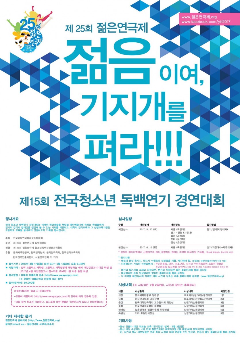 제 15회 전국청소년 독백연기 경연대회 페이지 정보 작성자 관리자 댓글 0건 조회 30,560회 작성일 17-04-11 15:58 본문 제 15회 전국청소년 독백연기 경연대회 목록 이전글 [뮤직센터]합주시설 무료 대여 17.04.22 다음글 [드라마센터] 성인데뷔반 모집 17.04.08