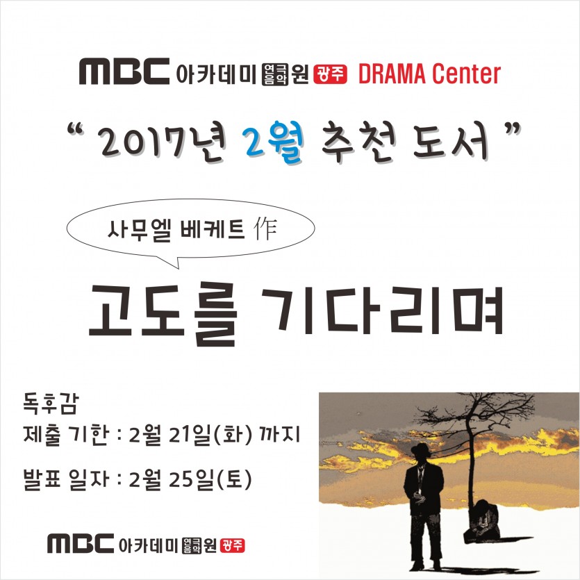 2월 추천도서 "고도를 기다리며" 페이지 정보 작성자 관리자 댓글 0건 조회 30,177회 작성일 17-02-06 20:43 본문 독후감 제출 기한 : 2월 21일(화) 까지 발표 일자 : 2월 25일(토) 목록 이전글 재입시반 개강!!!! 17.02.14 다음글 [뮤직센터]프렌쉽위크-싱어송라이터 17.01.20