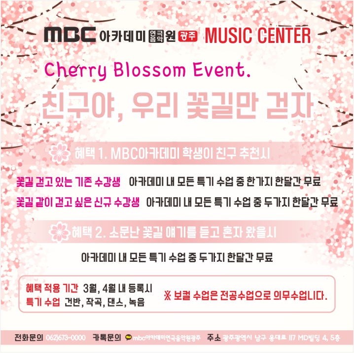 [뮤직센터]벚꽃이벤트-친구야! 우리 꽃길만 걷자 페이지 정보 작성자 관리자 댓글 0건 조회 29,906회 작성일 17-03-03 22:31 본문 새학기 이벤트 벚꽃이벤트-친구야! 우리 꽃길만 걷자 목록 이전글 3월,4월 추천도서 " 벚꽃동산 " 17.03.08 다음글 [드라마센터]벚꽃이벤트-친구야!우리 꽃길만 걷자 17.03.03