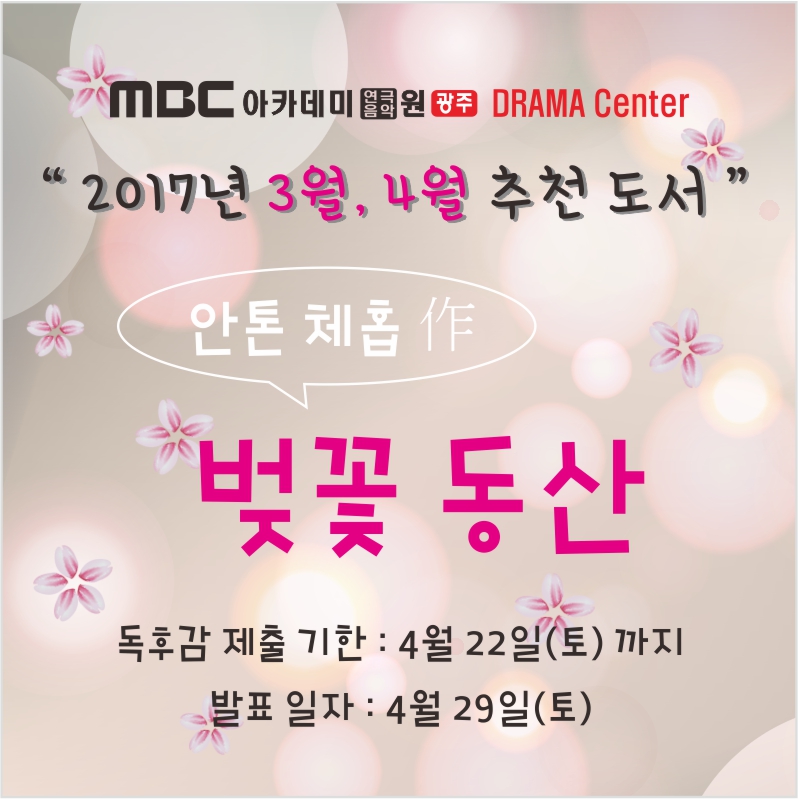 3월,4월 추천도서 " 벚꽃동산 " 페이지 정보 작성자 관리자 댓글 0건 조회 29,768회 작성일 17-03-08 19:17 본문 안톤체홉 "벚꽃동산" 목록 이전글 [드라마센터]성인데뷔반 모집! 17.03.10 다음글 [뮤직센터]벚꽃이벤트-친구야! 우리 꽃길만 걷자 17.03.03