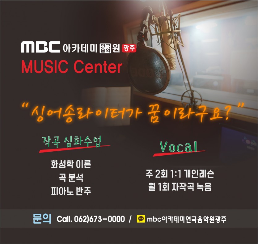 [뮤직센터]싱어송라이터가 꿈이라구요? 페이지 정보 작성자 관리자 댓글 0건 조회 29,658회 작성일 16-11-29 21:14 본문 싱어송라이터가 꿈이라구요? MBC아카데미연극음악원의 뮤직센터로 오세요 ^^ 목록 이전글 [드라마센터]Friendship Week!! 16.12.27 다음글 [뮤직센터]오디션반 수강생 모집 16.11.18