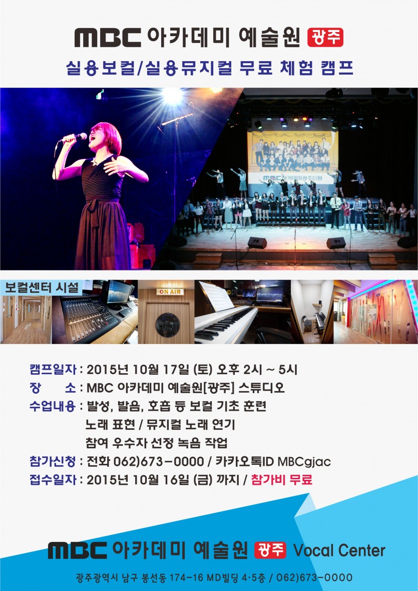 실용보컬/실용뮤지컬 체험캠프 페이지 정보 작성자 관리자 댓글 0건 조회 23,953회 작성일 15-10-02 16:10 본문 실용보컬/실용뮤지컬 체험캠프 목록 이전글 연극영화과 / 뮤지컬과 무료 체험캠프 15.10.29 다음글 울림엔터테인먼트 오디션 15.09.12