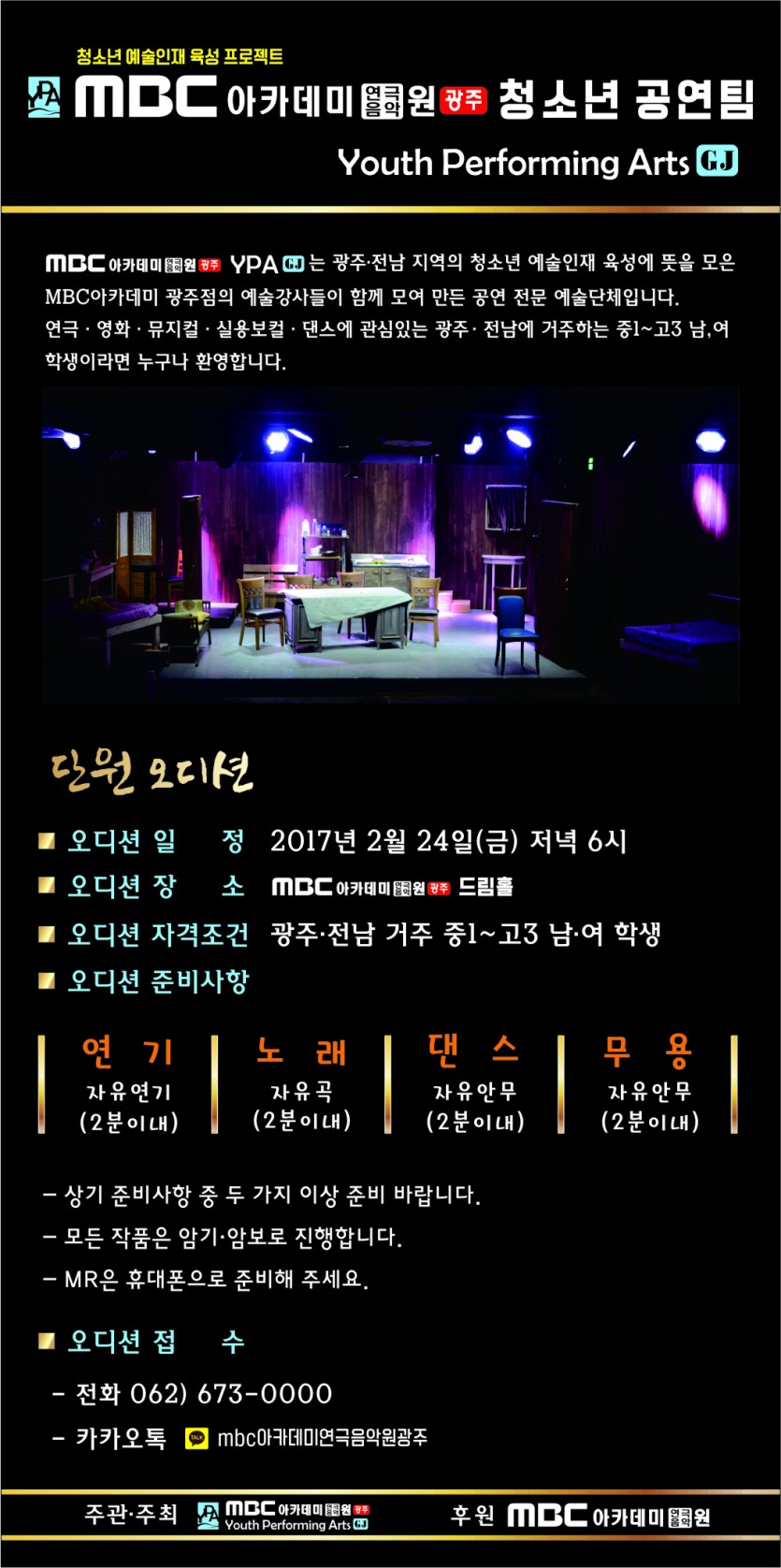 MBC아카데미연극음악원[광주] 청소년공연팀 오디션 [Youth Performing Arts GJ] 페이지 정보 작성자 관리자 댓글 0건 조회 23,462회 작성일 17-02-01 15:50 본문 MBC아카데미연극음악원 청소년공연팀 오디션 목록 이전글 FNC 엔터테인먼트 내방오디션 17.02.07 다음글 [뮤직센터] 수험생 이벤트 16.11.24