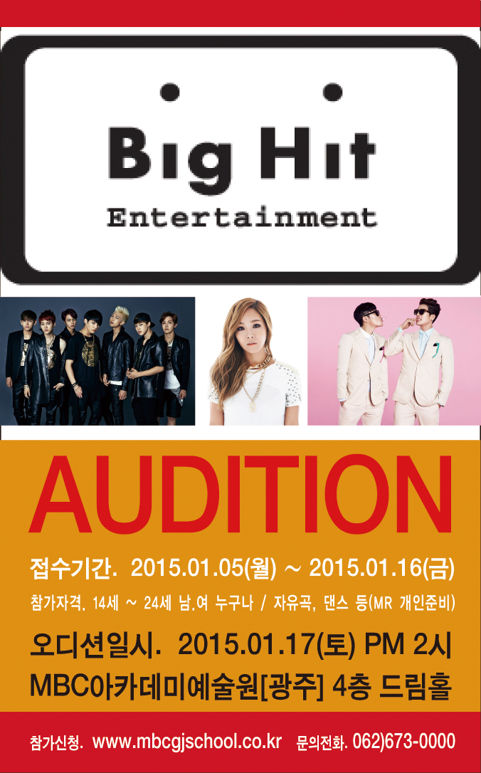 빅히트엔터테인먼트 오디션 페이지 정보 작성자 관리자 댓글 0건 조회 22,983회 작성일 15-01-22 18:30 본문 방탄소년단, 옴므, 임정희 등 소속되어 있는 빅히트엔터테인먼트 오디션 목록 이전글 N company entertainment AUDITION!!! 15.02.10 다음글 키이스트 오디션 14.11.12